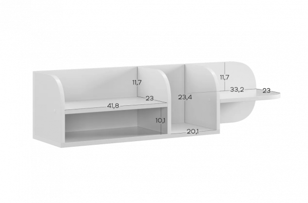 Полка состоит из прочного ЛДСП и имеет две открытые секции, которые удобно использовать для книг, игрушек, декора или учебных принадлежностей. Закруглённые боковые элементы придают конструкции мягкий, безопасный внешний вид, что особенно важно для детской комнаты.