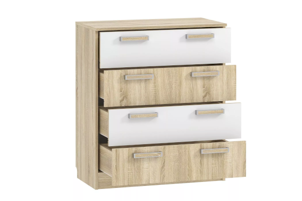 Комод «Фанк» -  идеально подходит для обустройства комнаты подростка. Светлые тона мебели, выдержанный стиль прекрасно смотрятся в любом интерьере. Четыре удобных выдвижных ящика – это огромный объем  для хранения белья, предметов одежды и аксессуаров. Выдвижные ящики оснащены шариковыми направляющими полного выдвижения, равномерно распределяют вес содержимого и обеспечивают плавный бесшумный ход ящика. Комод отлично сочетается с другими моделями коллекции «Фанк».