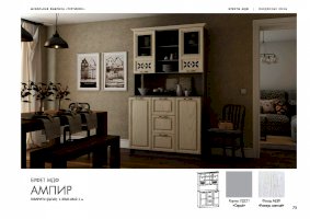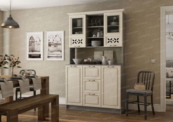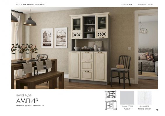 Буфет «Ампир» разместит в себе всю кухонную утварь. На его полках хватит места для различных видов посуды и инвентаря. Оригинальный дизайн модели оживляет интерьер. Резные элементы на дверцах и изящная фурнитура отлично сочетаются с текстурой дерева. Холодные светлые оттенки привносят в помещение кухни ощущение свежести и навевают приятные мечты.
