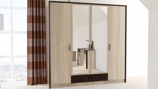 Классический распашной четырехдверный шкаф с дополнительным выдвижным ящиком выполнен в стиле минимализм: строгие черты, функциональность и простота. Контрастный профиль из МДФ 22мм по внешним углам со скругленными краями – максимально безопасное использование мебели. Кромка цвета венге подчеркивает древесную текстуру и рисунок светлого дуба сонома. Зеркала позволяют рассмотреть себя в полный рост, сделают комнату светлее и визуально просторнее. Шкаф легко впишется в обстановку любой комнаты.
