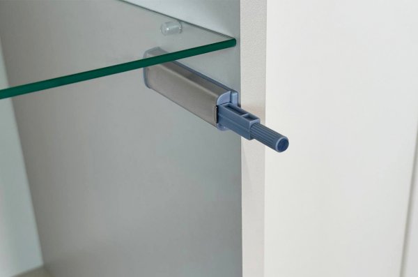 Шкаф оснащён надёжной металлической ручкой и имеет удобное внутреннее наполнение: надёжные полки за стеклянной и глухой дверцами, а также выкатной ящик. Это позволяет рационально использовать пространство.