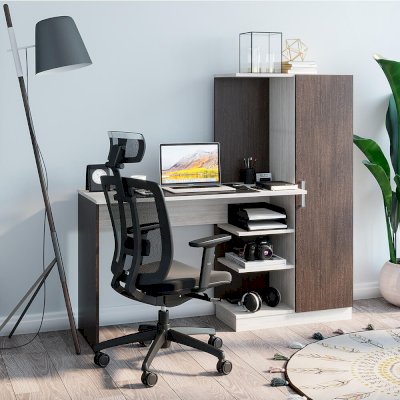 Обустроить место для работы или учебы можно с помощью компьютерного стола Бейсик. Модель сделана из ЛДСП двух цветов. Благодаря такому цветовому решению, изделие будет выигрышно смотреться в любом интерьере. Конструкция модели представляет собой вместительную столешницу, зону с открытыми полками. Небольшой пенал с распашной дверцей, в котором можно хранить необходимые для занятий вещи. Сборка универсальная.